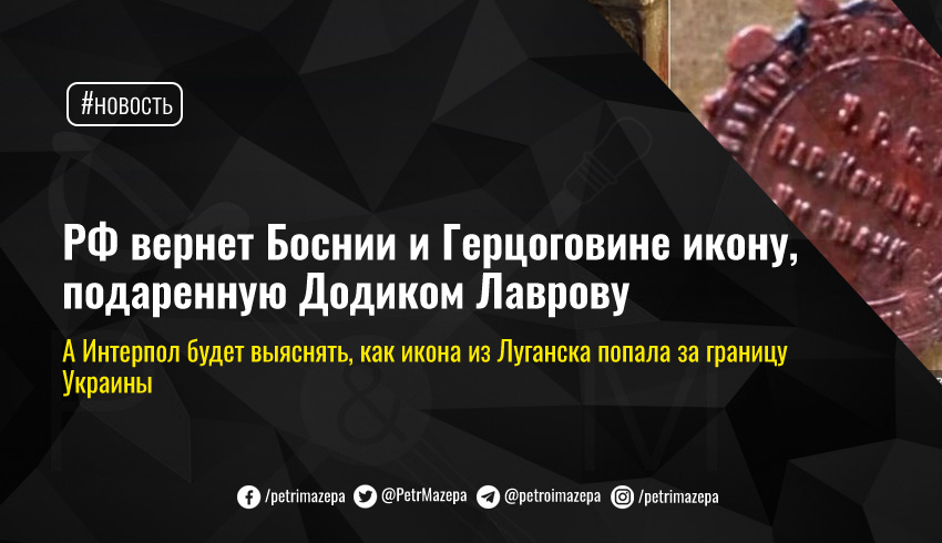 РФ вернет в Боснию и Герцоговину (БиГ) икону, подаренную в Сараево главе российского МИД Сергею Лаврову. Там ею займется Интерпол, который будет проверять, как старинная икона из Луганска попала в БиГ.