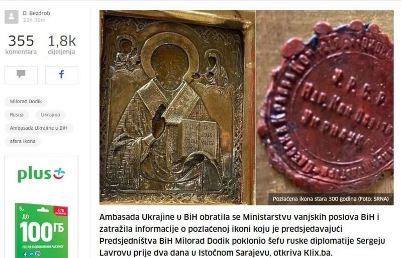 - 14 декабря главе МИД страны-агрессора во время визита в Сараево подарили старинную икону – которая принадлежит Украине. Посольство Украины в Боснии и Герцеговине уже направило ноту с требованием немедленно и однозначно выяснить, как 300-летняя икона из Луганска с украинской печатью попала в страну.