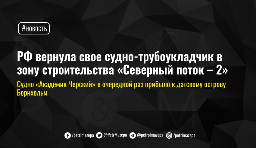Российский трубоукладчик «Академик Черский» спустя месяц пребывания у берегов Калининграда вернулся в зону достройки «Северный поток – 2»в исключительной экономической зоне Дании.