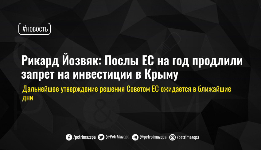 Корреспондент «Радио Свобода» Рикард Йозвяк сообщил, что послы ЕС дали «зеленый свет» для продолжения запрета ЕС на инвестиции в Крыму еще на год.