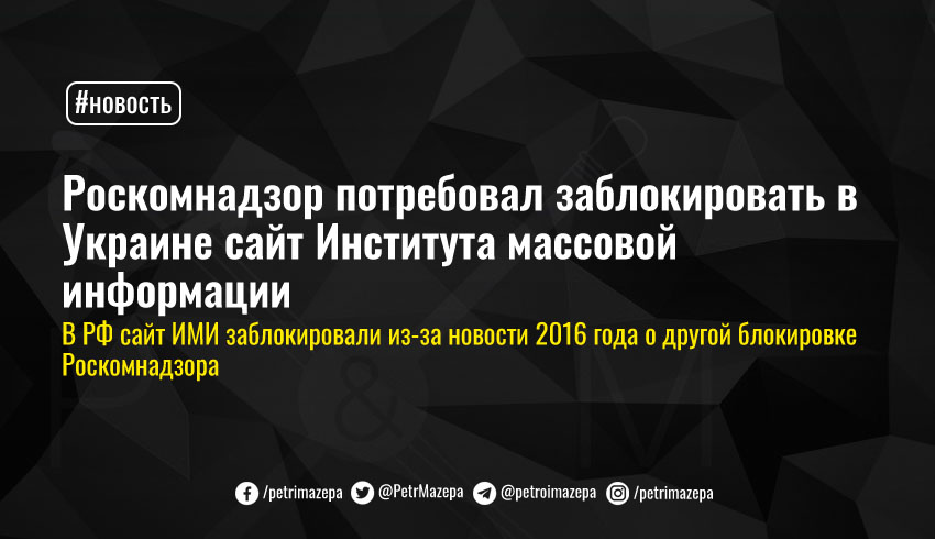Роскомнадзор заблокировал сайт украинского Института массовой информации (ИМИ) из-за новости за 2016 год на территории РФ и потребовал от украинского провайдера заблокировать доступ к сайту на территории Украины. Об этом сообщила в Facebook исполнительный директор ИМИ Оксана Романюк.