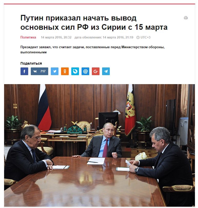 Уже вскоре после начала операции Путин подписал указ о выводе войск из Сирии. 14 марта 2016 года российские СМИ писали об этом так: «Считаю, что задачи поставленные перед Министерством обороны, в целом выполнены. Поэтому приказываю с завтрашнего дня начать вывод основной части нашей воинской группировки из Сирийской Арабской Республики», — заявил глава государства на встрече с министром иностранных дел Сергеем Лавровым и министром обороны Сергеем Шойгу».