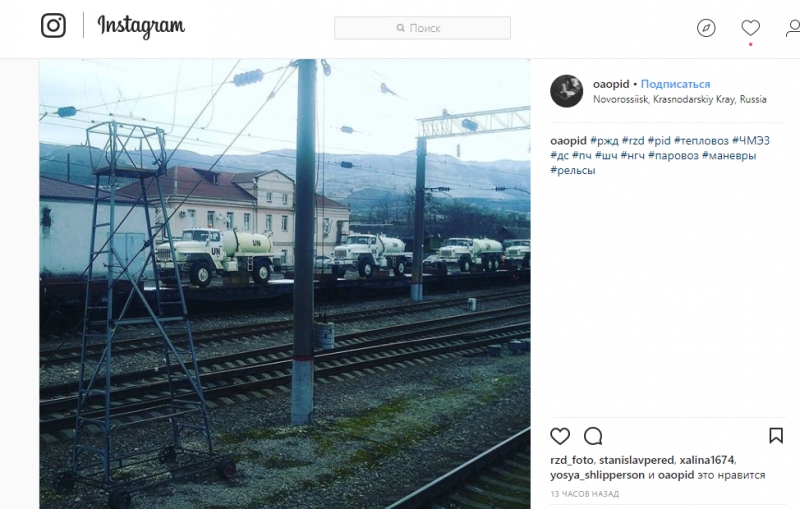 «5 марта пользователь Instagram — oaopid из Новороссийска, выкладывающий фотографии на железнодорожную тематику, опубликовал фото топливозаправщиков с маркировкой UN (United Nations) на ж/д платформе (оригинал)», - делится InformNapalm находкой своих волонтеров.