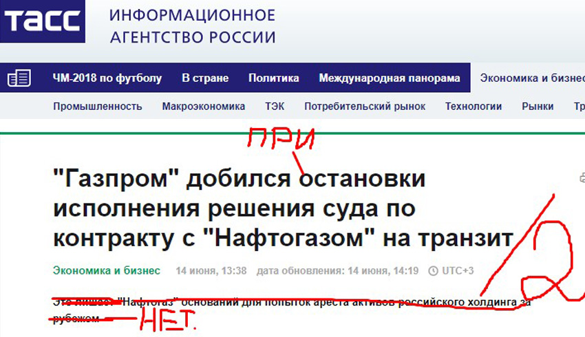 Не удержалось от преувеличений практически ни одно российское СМИ, включая некогда авторитетный ТАСС. Ходатайство было подано «Газпромом» 7 июня 2018 года в связи с обжалованием арбитражного решения по транзитному контракту. Таким образом россияне пытаются хотя бы ненадолго застопорить выполнение решения арбитража. О том, что про реальную борьбу речь не идет, говорит, как минимум тот факт, что «Нафтогаз» не был приглашен на слушания. То есть де факто учитывались аргументы только одной стороны. И поэтому решение было выдано всего через 6 дней после подачи жалобы.