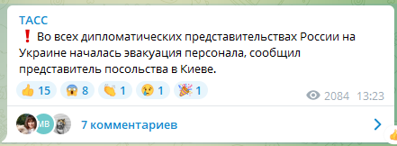 Россия уже начала вывозить персонал своих посольств из Украины, сообщает «ТАСС» со ссылкой на представителя посольства страны-агрессора в Киеве.