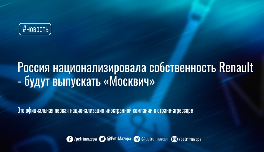 В россии заявили, что находящиеся на их территории активы французского автомобильного концерна Renault переходят в государственную собственность. Национализация иностранной компании стала первой в истории рф. Выпускать на отжатом заводе планируют «Москвич».