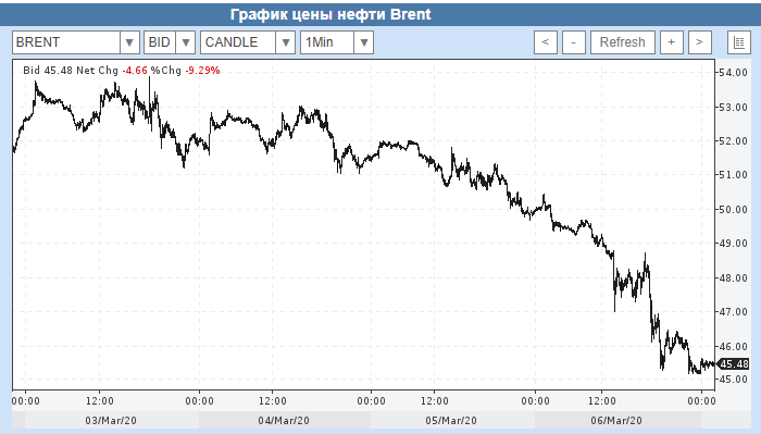 После известий о провале сделки, цена нефти марки Brent с поставкой в мае упала ниже 46 долл за баррель впервые с июня 2017 года. Отказ России от продления сделки с картелем будет стоить ей 100-150 млн долл в день оценил ситуацию совладелец «Лукойла» Леонид Федун пишет The Bell. Визуально российская недоговороспособность выглядит вот так.