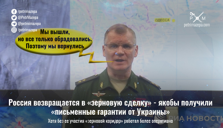Рассказать об этом снова доверили Минобороны рф. Где заявили очевидное, что сначала россия «приостановила реализацию соглашения по вывозу сельскохозяйственной продукции из украинских портов ("Черноморская инициатива")», а потом вернулась в нее.