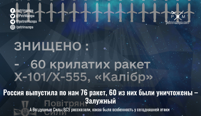 По предварительным данным, сегодня враг выпустил по нам 76 ракет, из них 72 крылатых и 4 управляемых авиационных ракеты. Сбиты были 60 ракет.