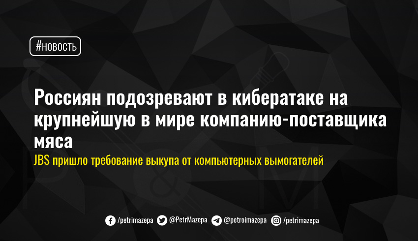 Бразильская компания JBS S.A., которая является крупнейшим поставщиком мяса в мире, пострадала от кибератаки. Из-за этого пришлось ограничить работу на заводах в Канаде, США и Австралии. Белый дом считает, что причастными к атаке могут быть российские хакеры.