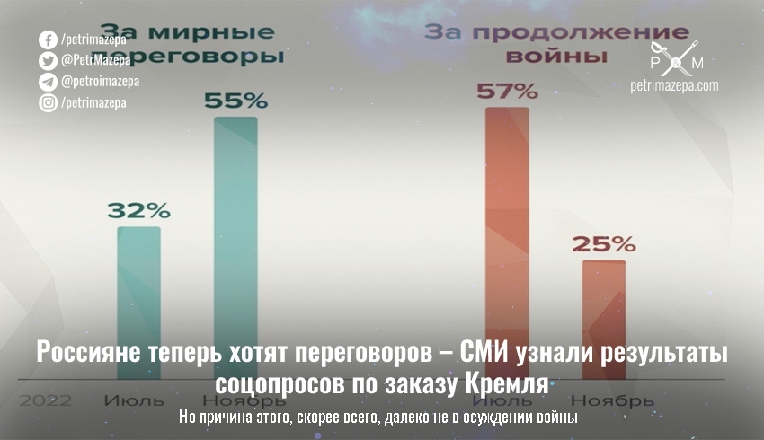 Россияне хотят переговоров – за начало диалога по миру с Украиной сейчас выступают 55% граждан страны-агрессора, а за продолжение войны выступают только 25%. Такие данные приводит «Медуза» со ссылкой на результаты закрытого соцопроса, проведенного по заказу Кремля.