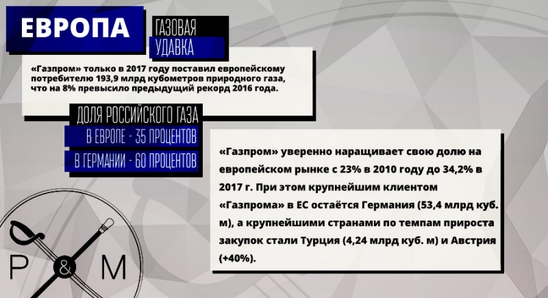 Таким образом, Европа будет и впредь нуждаться в иностранных поставках газа, поскольку собственное производство снижается из-за истощения газовых месторождений и одновременно увеличения потребления. По оценкам европейских энергетических компаний, к 2035 году ЕС может понадобиться дополнительно 107 млрд кубометров газа в год. А значительная часть потребляемого в ЕС газа сегодня поступает из России. «Газпром» только в 2017 году поставил европейскому потребителю 193,9 млрд куб. м природного газа, что на 8% превысило предыдущий рекорд 2016 года. В целом доля российского газа на европейском рынке составляет около 35%, а в Германии этот показатель достиг почти 60%. «Газпром» уверенно наращивает свою долю на европейском рынке с 23% в 2010 году до 34,2% в 2017 г. При этом крупнейшим клиентом «Газпрома» в ЕС остаётся Германия (53,4 млрд куб. м), а крупнейшими странами по темпам прироста закупок стали Турция (4,24 млрд куб. м) и Австрия (+40%).