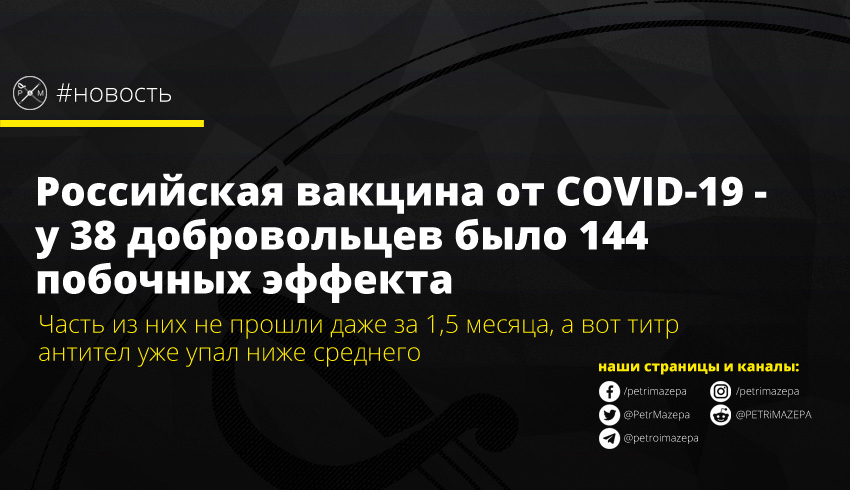 Вчера в РФ с помпой и говорящей головой Путина презентовали российскую вакцину. Чтобы зарегистрировать ее в Минздраве РФ пришлось отказаться от третьего этапа испытаний – на больших группах доробвольцев. Но даже у тех 38 человек, которые принимали участие во втором этапе исследований было более сотен побочных эффектов, часть из которых не прошла до сих пор.