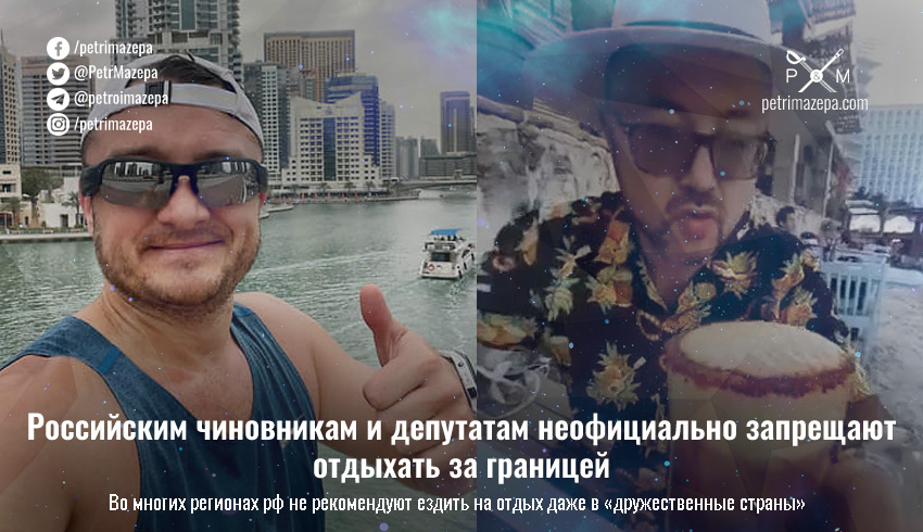 В рф региональным чиновникам и депутатам стали неофициально запрещать отдыхать за границей. Или в более мягких случаях настоятельно рекомендуют не распространять в соцсетях упоминания о таком отдыхе. Даже если он проходил в «дружественных странах».
