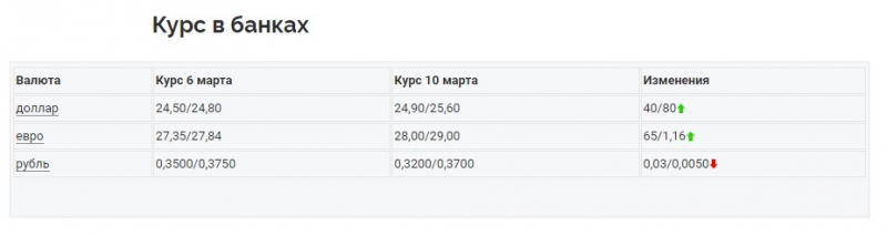 По данным Нацбанка, на утро 10 марта в Украине курс доллара составлял 24,9 грн/долл, евро – 28,2 грн/евро, 0,365 грн/руб. В банках доллар в покупке подорожал на 40 копеек, а в продаже на 80 копеек. Евро повысился в покупке на 65 копеек, а в продаже на 1 гривну 16 копеек, передает Minfin.com.ua.