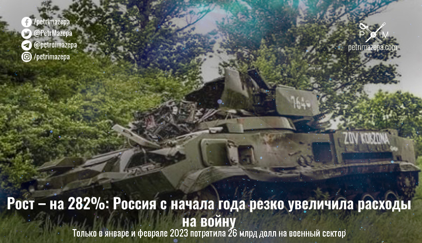 Россия потратила 2 трлн рублей (26 млрд долл.) на военный сектор только в январе и феврале 2023 года, что на 282% больше, чем за тот же период прошлого года.