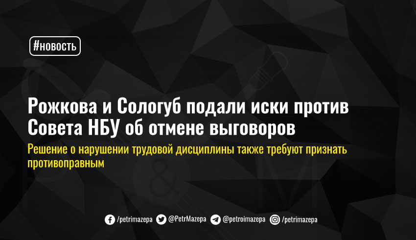 Первый замглавы НБУ Екатерина Рожкова и замглавы НБУ Дмитрий Сологуб подали в Окружной административный суд Киева иск против Совета НБУ. Они требуют признать противоправным и отменить решение Совета об оценке их действий от октября 2020 года. 6 октября 2020 года решением Совета НБУ Рожковой и Сологубу был объявлен выговор.
