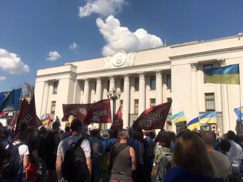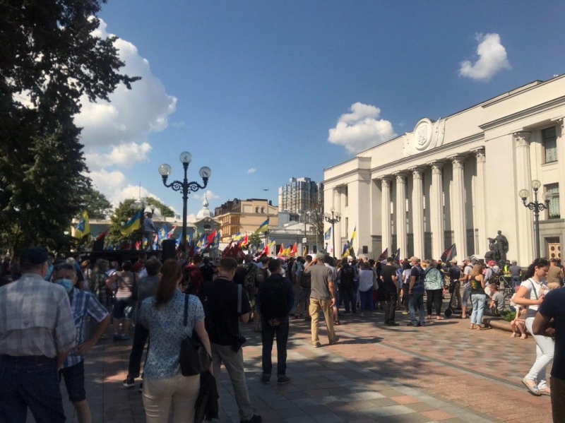 Под Верховной Радой продолжаются протесты против «языкового» законопроекта нардепа от «Слуги народа» Максима Бужанского.