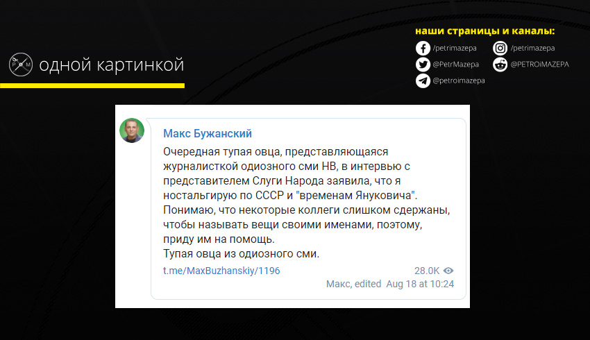 Блогер Макс Бужанский, ставший избранным нардепом от «Слуги народа», обозвал в своем Telegram-канале журналистку «Нового времени» Ольгу Духнич «тупой овцой». Причиной стало воскресное интервью, в котором Бужанского охарактеризовали как «ностальгирущий по СССР и временам Виктора Януковича». Сегодня партия выпустила официальную оценку действий своего члена.