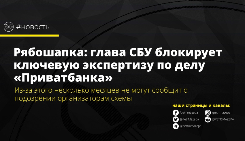«Еще одно важнейшее для Украины производство может быть быстро завершено, как только друг президента, глава СБУ, разблокирует проведение ключевой экспертизы в одном из производств НАБУ по "Приватбанку". Уже несколько месяцев заблокированная руководством СБУ экспертиза спасает организаторов миллиардной схемы от сообщения о подозрении. Напомню, что по закону сообщить о подозрении без установления экспертизой ущерба НАБУ/САП не имеют права», - пишет Рябошапка.