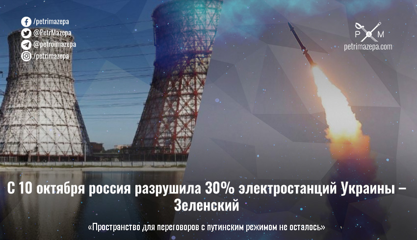 Президент Владимир Зеленский сообщил, что с 10 октября россия уже уничтожила 30% электростанций Украины, что привело к массовым отключениям электроэнергии по всей стране.