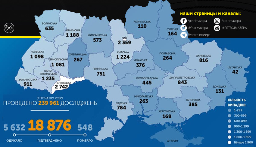 Всего в Украине подтверждено 18876 случаев COVID-19, из них 5632 выздоровели (+356 за сутки), 548 умерли (+13 за сутки). За вчера подтвердили 260 случаев. Всего в Украине исследовано 232 899 образцов методом ПЦР, из них вчера – 7062.
