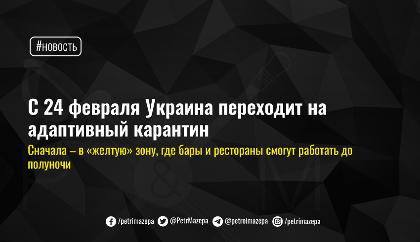 Министр культуры Александр Ткаченко уточнил, что адаптивный карантин начнет действовать с 24 февраля и продлится, как минимум, до 30 апреля этого года. Также он отметил, что кафе и другие заведения смогут работать и при плотности размещения посетителей 1 человек на 4 кв. метра.