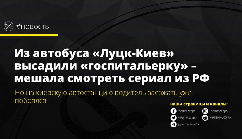 Вчера вечером ветеран батальона «Госпитальеры» Ярина Чорногуз не смогла доехать на автобусе до Киева несмотря на купленный билет. Причина – российский сериал, который водитель компании Busfor.ua, отказался выключать, если этого не потребует большинство пассажиров автобуса. Большинству оказалась «какая разница» и оно промолчало, но Чорногуз и ее знакомая отказалась ехать дальше под творчество страны-агрессора. Поэтому их ссадили с рейса посреди трассы.