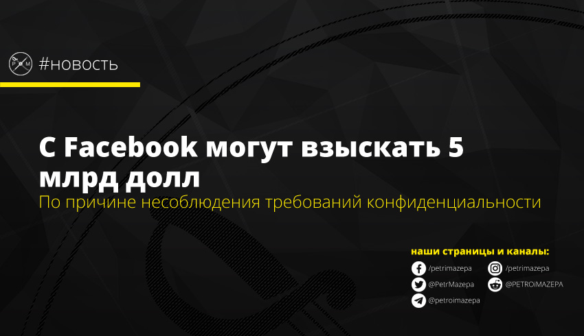 Федеральная комиссия по торговле США (F.T.C.), по информации американских СМИ, намеревается наложить штраф на компанию Facebook на сумму до 5 миллиардов долларов. Причиной тому – нарушения, касающиеся конфиденциальности пользователей.