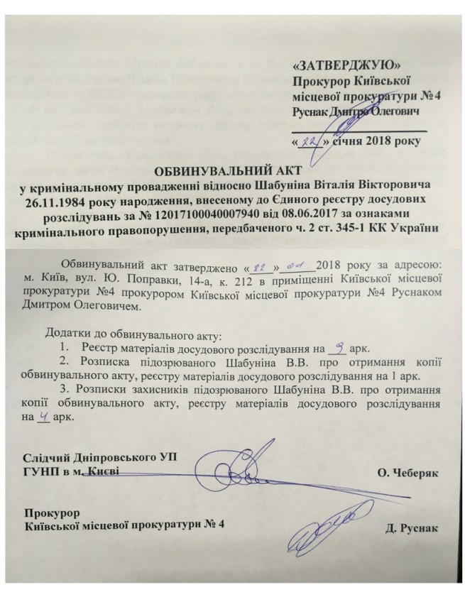 Главе Центра противодействия коррупции Виталию Шабунину вручили копию обвинительного акта по криминальному производству по статье 345-1 части 4 УК Украины (насилие против журналиста).