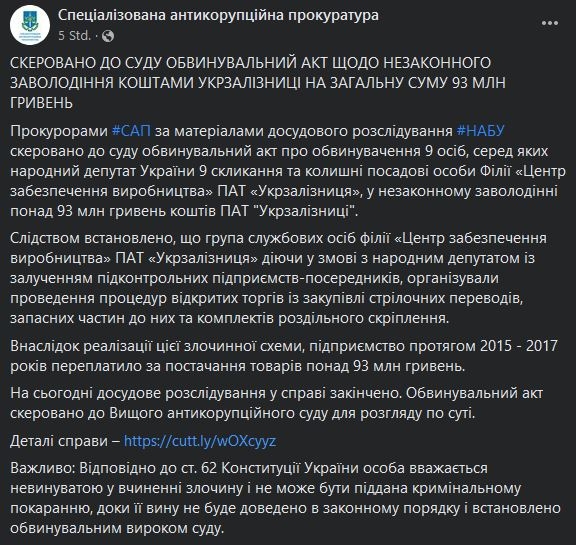 Следствие считает, что должностные лица закупочного филиала УЗ в сговоре с депутатом и менеджерами нескольких фирм организовали схему приобретения стрелочной продукции по завышенным ценам. В результате с декабря 2015 года по март 2017 года УЗ получила убыток в сумме 93,28 млн грн.