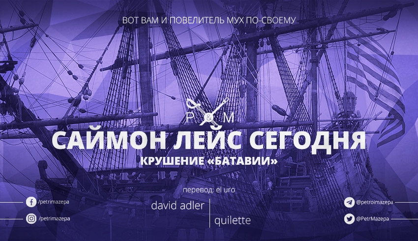 Кораблекрушение и бунт, случившиеся в XVII веке у берегов Австралии, на первый взгляд кажутся происшествием, не имеющим никакого отношения к Китаю Мао. Но на самом деле это странным образом похожее событие, имеющее аналогичную тоталитарную динамику, поэтому неудивительно, что Лейс был так очарован мрачной историей «Батавии». История того, что случилось с кораблём и его командой, в своё время взбудоражила современников, но затем была в значительной степени забыта, пока интерес не возродился вновь в результате повторного открытия обломков корабля в 1963 году. Исследования Лейса опирались на первоисточники и книгу Майка Даша (Mike Dash) «Кладбище Батавии» (некоторые сюжеты имеют свойство повторяться многократно, читавший «Повелителя мух» поймёт меня — прим. пер.).