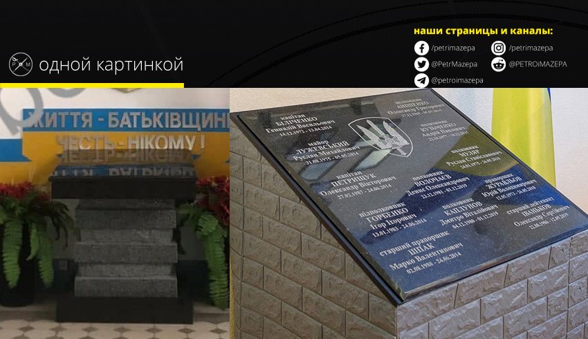 И просит «отдельных "экспертов" не спекулировать на памяти погибших Героев». Однако в комментариях у публикации читатели говорят, что плита непохожа на фото, опубликованное Березовцем. По двум фото, правда, с уверенностью можно констатировать только то, что у плиты сменили постамент. Также, СБУ не показала герб, который был в холле.