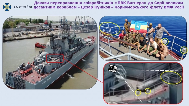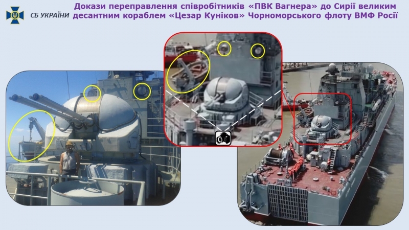 В СБУ отметили, что приведенные факты использования боевого корабля Черноморского флота ВМФ РФ для переправки наемников ЧВК «Вагнера» в Сирию не единичны. В целом СБУ удалось установить личности 125-ти граждан Украины, причастных к террористической деятельности российских спецслужб в составе ЧВК «Вагнера» на территории Украины, Сирии, ЦАР и Судана.