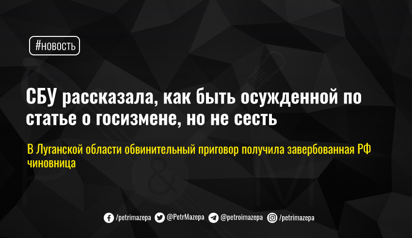 Службы безопасности Украины сообщила, что Беловодский районный суд Луганской области вынес обвинительный приговор за государственную измену руководительнице структурного подразделения одного из областных государственных учреждений. Несмотря на тяжелую статью и обвинительный приговор, чиновница за решетку не отправилась.