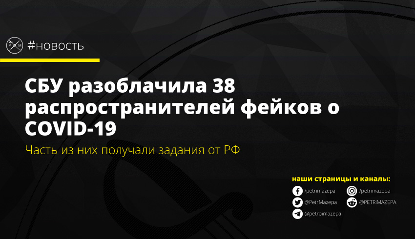 Служба безопасности Украины (СБУ), начиная с 16 марта выявила 38 человек, которые занимались распространением фейков о коронавирусе. Сотрудники СБУ передали Нацполиции информацию для применения к ним мер административного воздействия. Часть разоблаченных распространителей имели кураторов в РФ.