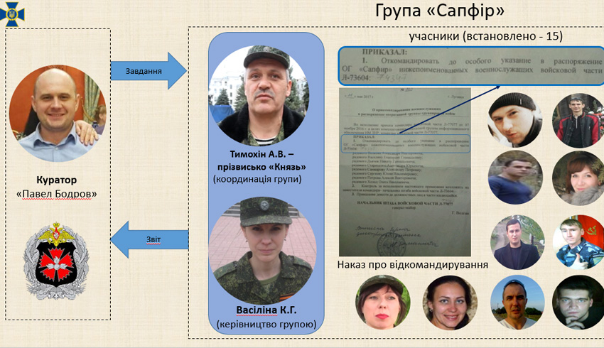 Сотрудники военной контрразведки СБУ идентифицировали «куратора» этого информационного подразделения, кадрового сотрудника ГУ ГШ ВС РФ подполковника Сазонова Александра Алексеевича, оперативный псевдоним - «Павел Бодров». В состав подразделения «Сапфир» входит пятнадцать идентифицированных членов НВФ так называемой «народной милиции «ЛНР». Возглавляет группу завербована военной разведкой России гражданка Украины - Василина Екатерина Геннадьевна, сообщил руководитель военной контрразведки СБУ Сергей Левченко.