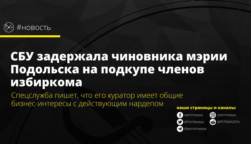 «Оперативники спецслужбы установили, что организатором подкупа является начальник одного из управлений Подольского горсовета, который также является депутатом совета города. За различные суммы вознаграждения он предложил члену городского избиркома не регистрировать кандидатов от конкурирующей политической силы и обеспечить положительное голосование по лоббистским вопросам его партии», - сообщает СБУ.
