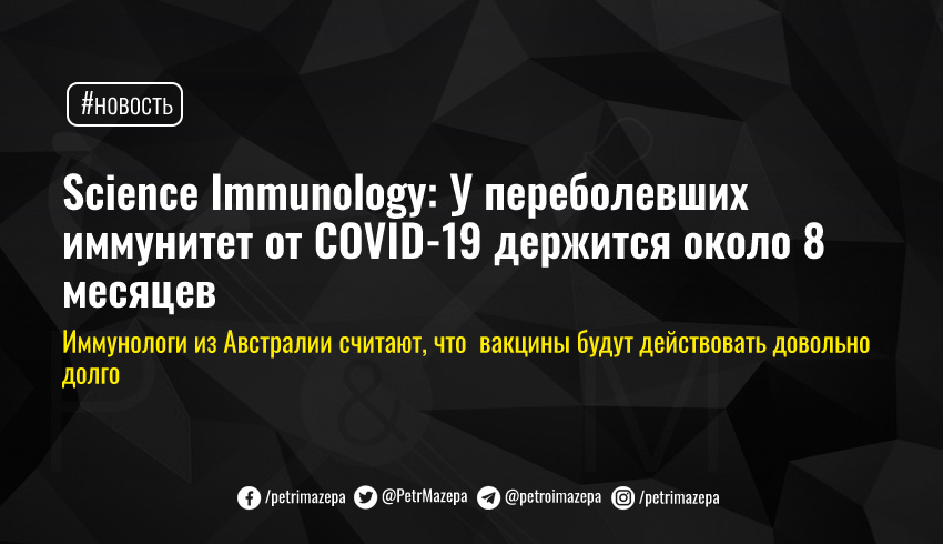 Ученые из Австралии пришли к выводу, что у людей, которые переболели COVID-19 вырабатывается долгосрочный клеточный иммунитет против вируса SARS-CoV-2. Согласно данным иммунологов Университета Монаша, защита от коронавируса держится по меньшей мере на протяжении восьми месяцев.