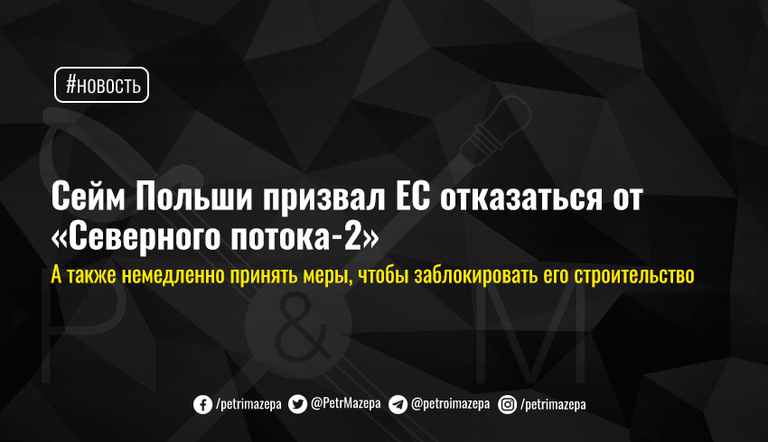 «Сейм Республики Польша, выражая солидарность с нашими соседями в Центральной Европе, находящимися под угрозой экспансионизма России, прежде всего с Украиной, призывает ЕС и его государства-члены, в том числе Германию, нашего союзника по НАТО и партнера в Евросоюзе, отказаться от любой поддержки реализации проекта газопровода «Северный поток-2», - отмечается в резолюции.