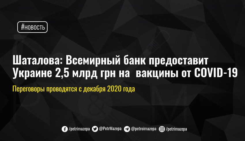 Замминистра здравоохранения Светлана Шаталова сообщила, что Всемирный банк предоставит Украине помощь почти в 2,5 млрд грн на закупку вакцин от коронавируса.