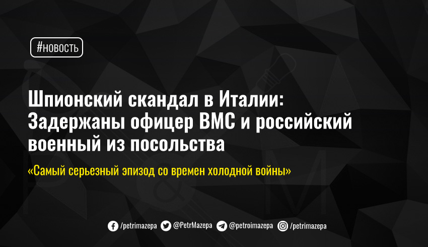 Итальянские карабинеры вместе с внутренней разведкой и штабом обороны страны задержали в Риме старшего офицера Военно-морских сил Италии и российского солдата, работающего в посольстве. Издание называет случившееся самым серьезным эпизодом шпионажа в стране со времен холодной войны.