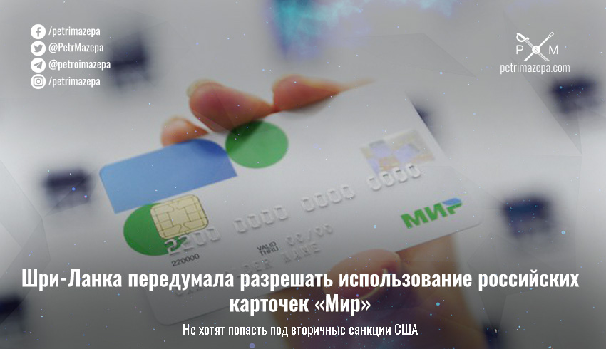 «Из-за санкций США против платежной системы "Мир", которые подтверждаются Министерством иностранных дел Шри-Ланки, CBLS в настоящее время не может положительно рассмотреть запрос на операции с карточками "Мир" в банковской системе», — говорится в сообщении Центрального банка страны (CBSL) в Twitter.