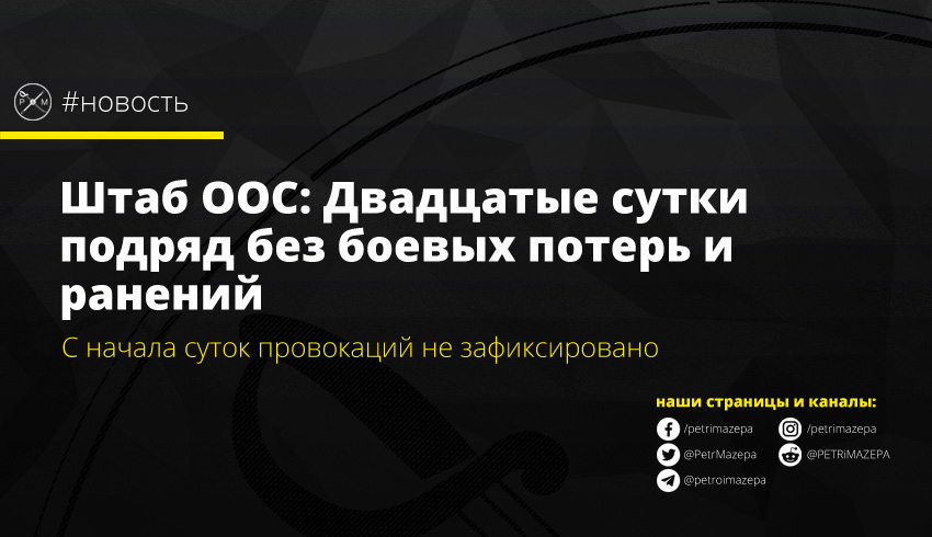 «Двадцатые сутки подряд, с тех пор объявлен режим прекращения огня, который вступил в силу с 27 июля, среди личного состава Объединенных сил боевых потерь и ранений нет. Наши защитники не теряют бдительности и готовы мгновенно реагировать на любые изменения оперативной обстановки», - говорится в вечерней сводке на странице Операции Объединенных Сил в Facebook.