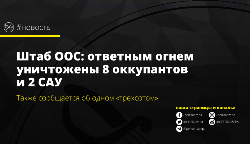 «После подавления вражеской активности восемь оккупантов погибли, один ранен. Также благодаря умелым и решительным действиям наших воинов были уничтожены один блиндаж и две самоходные артиллерийские установки захватчиков, которые находились на огневых позициях противника с существенным нарушением линии отвода согласно Меморандуму и Комплексу мероприятий по выполнению Минских договоренностей», - сообщает в штабе со ссылкой на данные разведки.