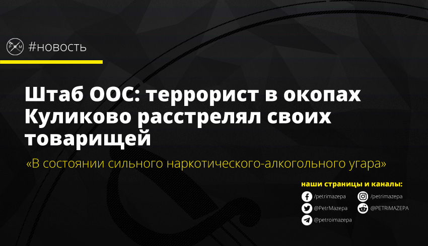 Сообщается, что местом действия стали передовые окопы террористов возле населенного пункта Куликово (Донецкая обл.). А сам инцидент произошел в одном «из батальонов 9 омсп. В частности, стало известно о том, что один из боевиков подразделения, нес дежурство на одной из передовых позиций в окопе, находясь в состоянии сильного наркотического-алкогольного угара, расстрелял боевиков со своей роты, находившихся рядом с ним».