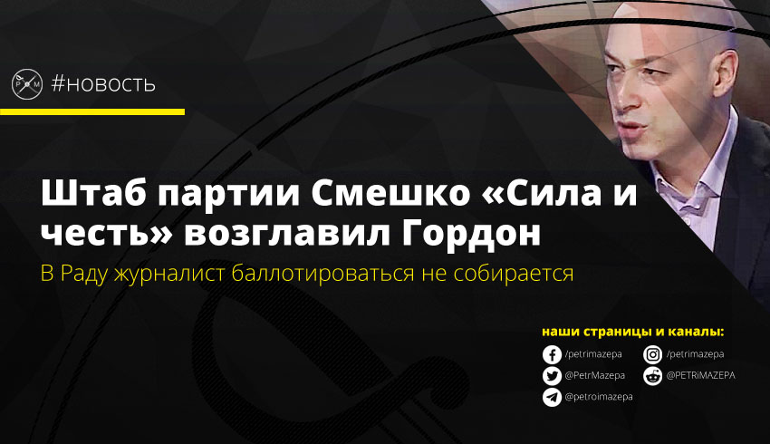 Журналист Дмитрий Гордон стал начальником предвыборного штаба партии «Сила и Честь» бывшего главы СБУ и экс-начальника Главного управления военной разведки Минобороны Игоря Смешко. При этом Гордон не собирается баллотироваться в Верховную Раду, а после выборов сразу вернется к профессиональной деятельности.