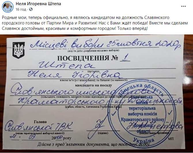 Штепа также опубликовала удостоверение кандидата с печатью Славянской городской территориальной избирательной комиссии.