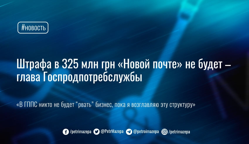 Глава Госпродпотребслужбы (ГППС) Владислава Магалецкая заявила, что штрафа в 325 млн грн компании «Новая почта» не будет, потому что штраф не адекватен нарушению. Она призвала менять законодательство для недопущения подобных случаев с исполнителями на местах, и пообещала встретиться с представителями бизнеса.