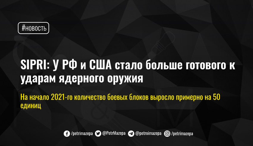 В докладе Стокгольмского института исследования проблем мира (SIPRI) значится, что РФ увеличила свой общий ядерный арсенал примерно на 180 боезарядов. Страна-агрессор это сделала в основном за счет развертывания межконтинентальных баллистических ракет наземного базирования с несколькими боеголовками (МБР) и морского базирования (БРПЛ).